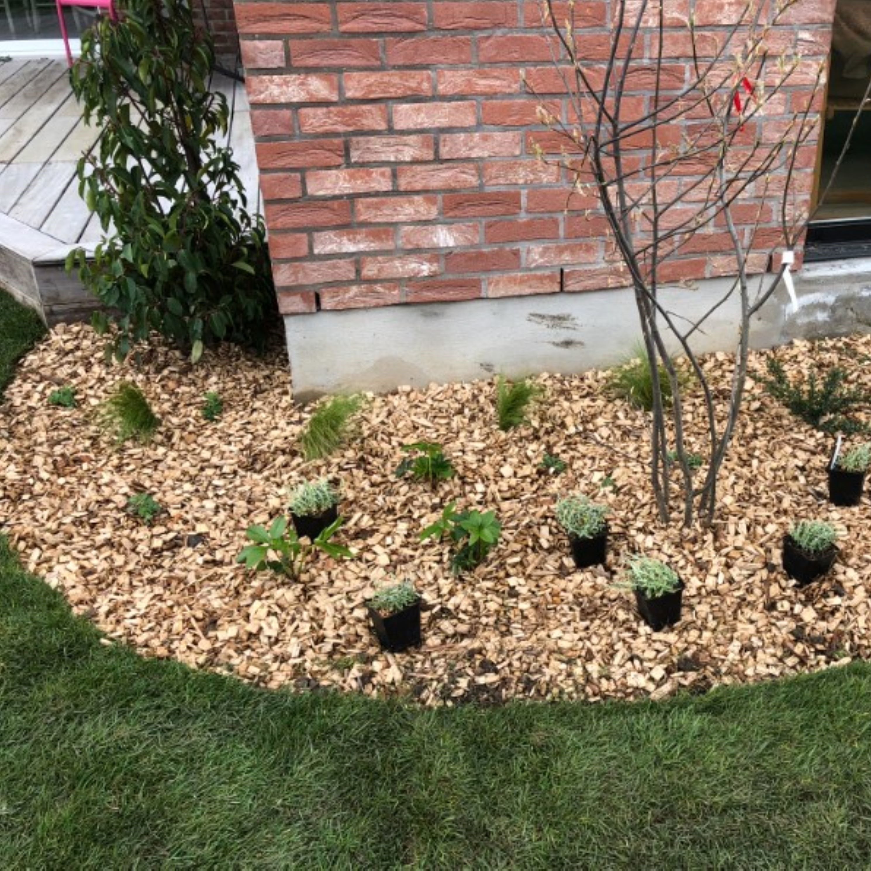 Grâce à la pose d’un géotextile et d’un paillage organique, les mauvaises herbes sont fortement limitées.